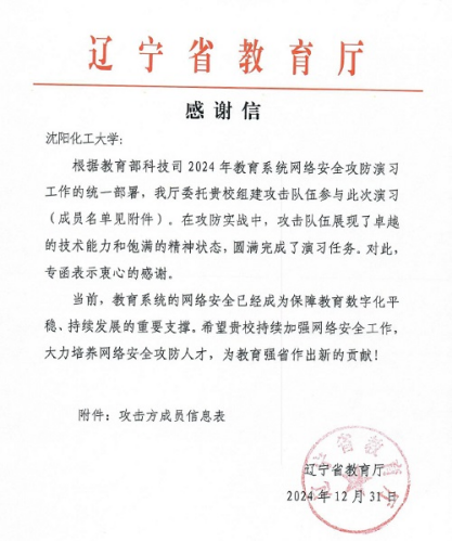 在教育部科技司组织的2024年教育系统网络安全攻防演习中,我校计算机科学与技术学院院长王军教授网络安全团队受辽宁省教育厅委托参加此次演习。在攻防实战中,团队展现了卓越的技术能力和饱满的精神状态,圆满完成了演习任务,并收到了辽宁省教育厅的感谢信。