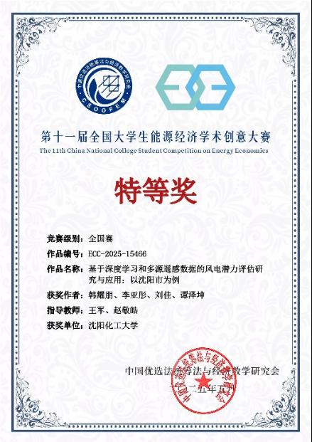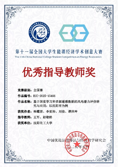 第十一届全国大学生能源经济学术创意大赛总决赛在5 月 24 日至 25 日举行。我校研究生韩耀鹏等学生的作品《基于深度学习和多源遥感数据的风电潜力评估研究与应用:以沈阳市为例》成功进入终审决赛,在激烈角逐中最终斩获全国研究生组特等奖。该作品由我校计算机科学与技术学院王军教授和中国科学院青岛生物能源与过程研究所田亚峻研究团队的赵敬皓工程师联合指导,是我校在该大赛中取得的历史最高奖项。