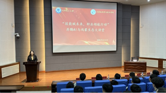 为助力学生把握人工智能与操作系统领域的前沿趋势,帮助学生消除信息差, 明确职业方向,提升职业竞争力,沈阳化工大学教务处、计算机科学与技术学院联合沈阳人工智能计算中心于2025年3月12日下午在碧帆楼304举办“技术赋能未来,职业领航行动”昇腾AI与鸿蒙生态大讲堂。教辅党总支书记林艳新、计算机科学与技术学院院长王军、副院长张波、党委副书记张丽以及沈阳人工智能中心生态总监姜昊、CTO董文博、鸿蒙生态中心主管孙惠参加,活动由计算机科学与技术学院辅导员张英和易柏言主持。