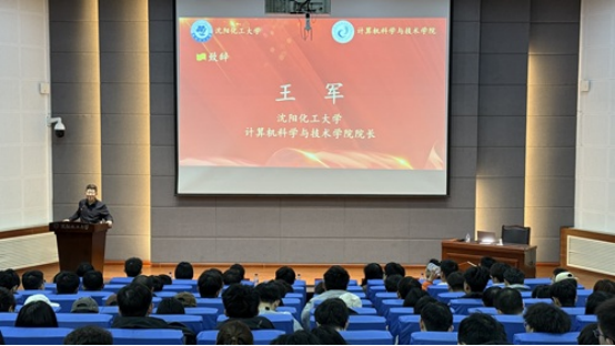 随后沈阳化工大学计算机科学与技术学院院长王军致辞,他强调AI是科技发展的成果,AI是同学们成长成才的有力工具,同学们应积极学习和掌握AI技术,将其应用于学习和实践中,提升自身能力,实现更大的发展。