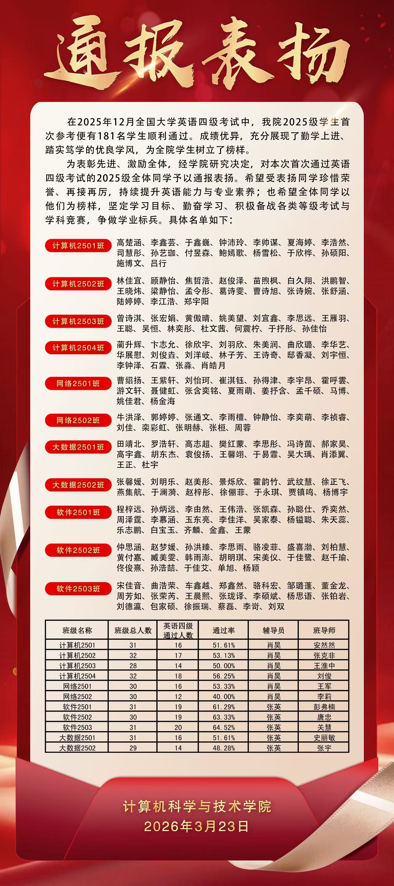 计算机科学与技术学院通报表扬2025级四级通过学生